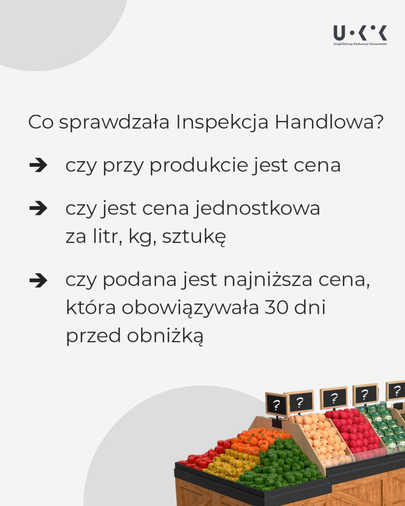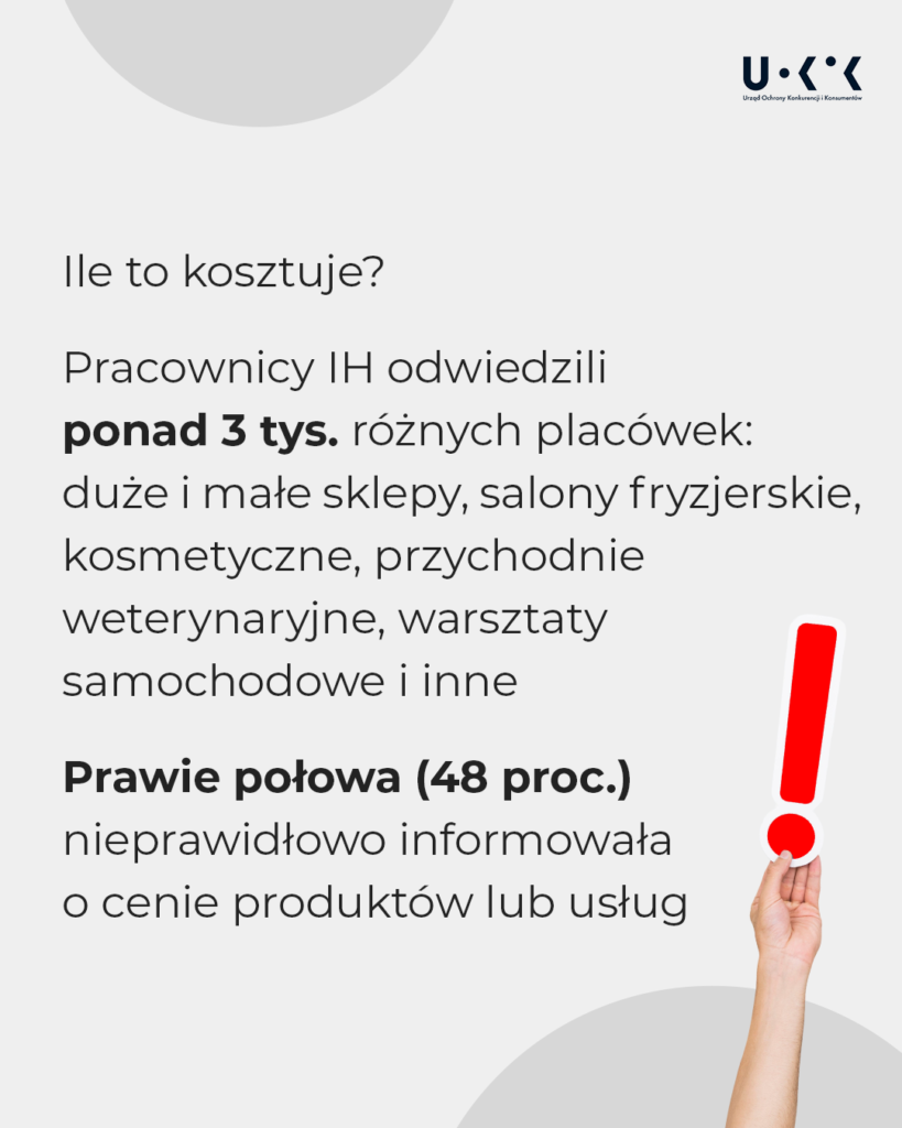 W ubiegłym roku Inspekcja Handlowa na zlecenie Prezesa UOKiK sprawdzała, jak przedsiębiorcy informują o cenach. Skontrolowała 3026 placówek, takich jak sklepy (w tym duże sieci handlowe), punkty usługowe (w tym przychodnie weterynaryjne, salony fryzjerskie, kosmetyczne, mechaników samochodowych), stacje benzynowe, parkingi, hotele. Oceniła sposób uwidocznienia ceny 461 437 produktów. Przedsiębiorcy zostali wybrani na podstawie monitoringu rynku, wyników poprzednich kontroli i sygnałów od konsumentów.