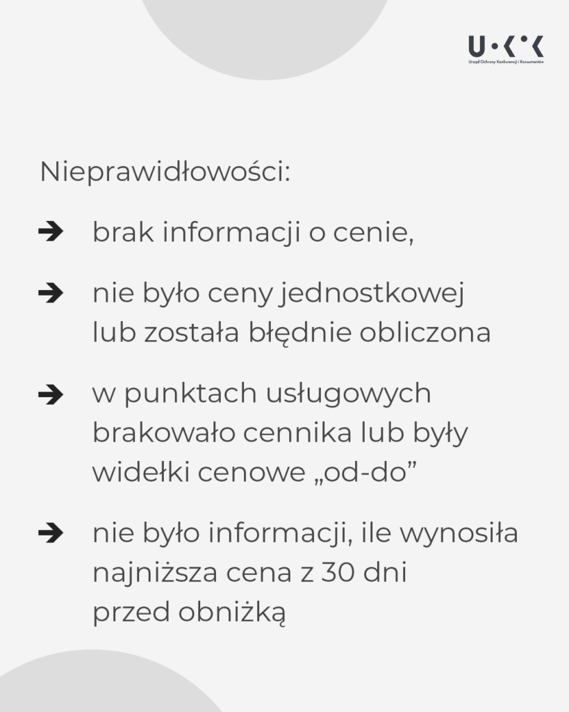 Prawie połowa skontrolowanych przedsiębiorców (1462) nieprawidłowo informowała o cenie. Różnego rodzaju nieprawidłowości dotyczyły 13 proc. skontrolowanych produktów (60 001). Najczęściej brakowało jakiejkolwiek informacji o cenie. Konsument nie wiedział więc ile zapłaci. Zdarzało się, że w przypadkach, gdy wymaga tego prawo, nie było ceny jednostkowej lub została błędnie obliczona. W punktach usługowych – u krawca, fryzjera, kosmetyczki, weterynarza i innych – brakowało cennika albo pojawiały się widełki cenowe „od-do”.